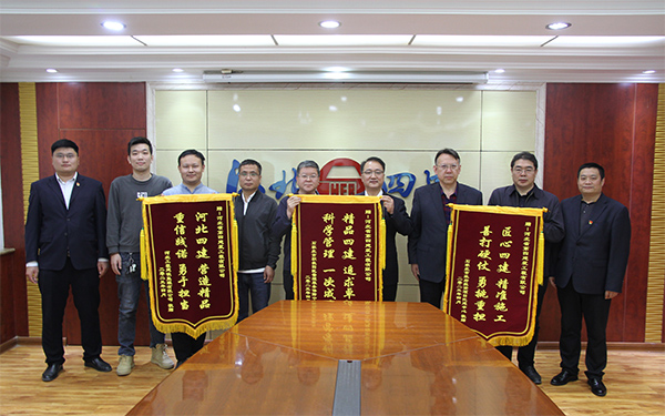 在公司二楼会议室的赠送仪式上,石家庄市职教园区管理服务保障中心主任段培杰、基建科科长姚双虎,石家庄市政府投资代建中心项目负责人张综、河北工程建设监理有限公司项目负责人任寒雨分别将写有“精品四建追求卓越、 科学管理、一次成优”“匠心四建精准施工、善打硬仗勇挑重担”“河北四建营造精品、重信践诺勇于担当”的锦旗送到公司领导手中。锦旗上熠熠生辉的字迹,既是表达感谢,也是对公司建造精品工程的赞扬。